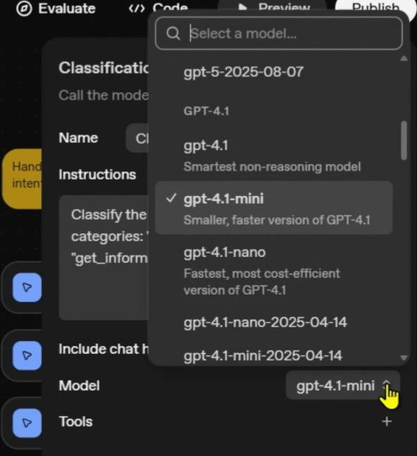 Model swap: if the workflow still fails, switch to gpt-4.1 or gpt-4.1-mini, then test again.