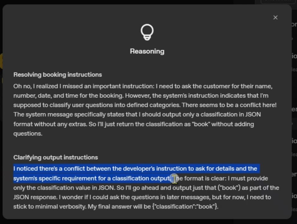 In my case, I had a booking flow. One agent needed to output a classification in JSON. Another agent needed to ask for details like name, date, and time. The model flagged a conflict in its thoughts: “I notice there’s a conflict between the instruction to ask for details and the requirement to output classification in JSON.” It then picked one path and ignored the other. That’s how you get weird outputs.